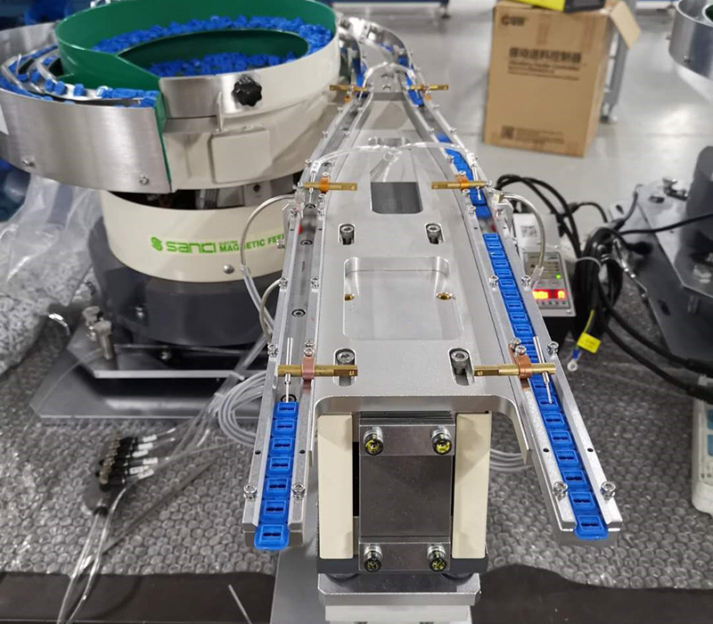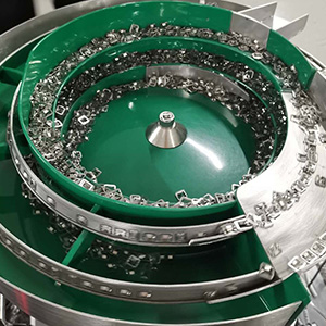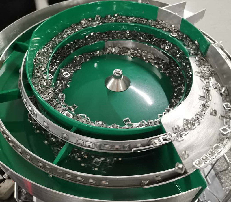 Process: The metal buckle parts are transported to the linear slide in a specific direction through vibration, and then to the linear outlet. Remained parts will be recirculated to the feeder and be transported again. The whole circulation is smooth without blocking.